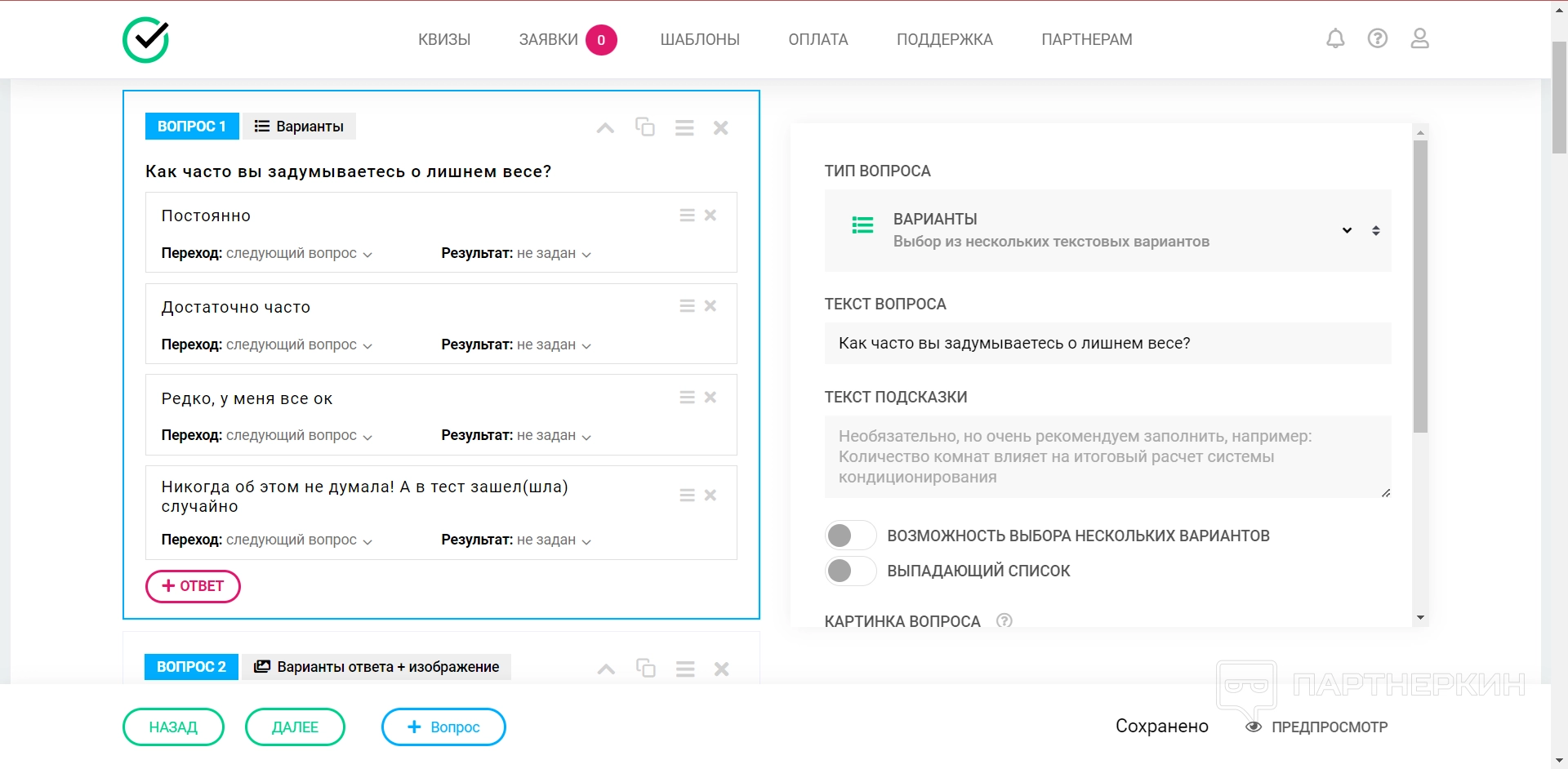Чтобы работать с сервисом, нужно зарегистрироваться на нем — сразу после пользователь может создать квиз с нуля, на основе шаблона или импортировать готовый для дальнейшей настройки.