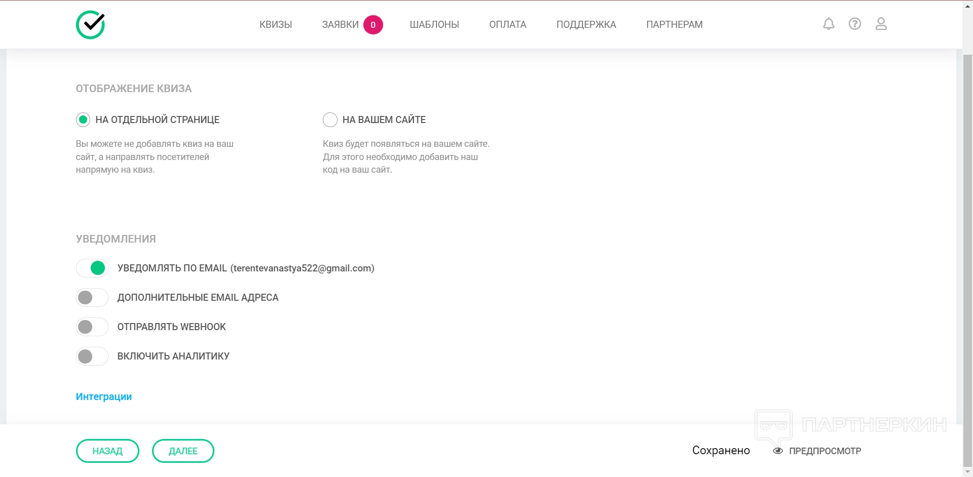В конце остается настроить отображение опроса — на отдельной странице или на собственном сайта. Также нужно отметить, куда будут поступать уведомления. По необходимости, можно активировать вебхуки и интегрировать опрос с CRM, аналитикой или по API с любым другим ресурсом.