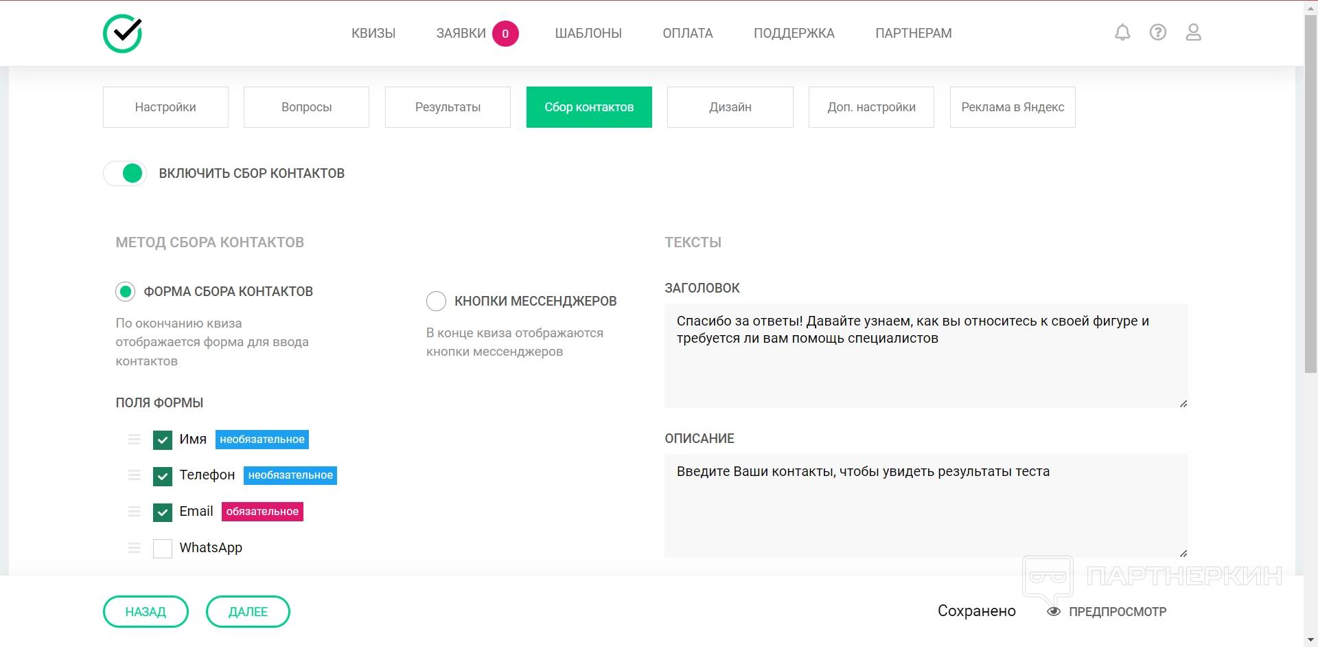 После настройки результатов нужно оформить страницу контактов — заполнить заголовок, описание, добавить соцсети и мессенджеры и добавить форму сбора контактов.