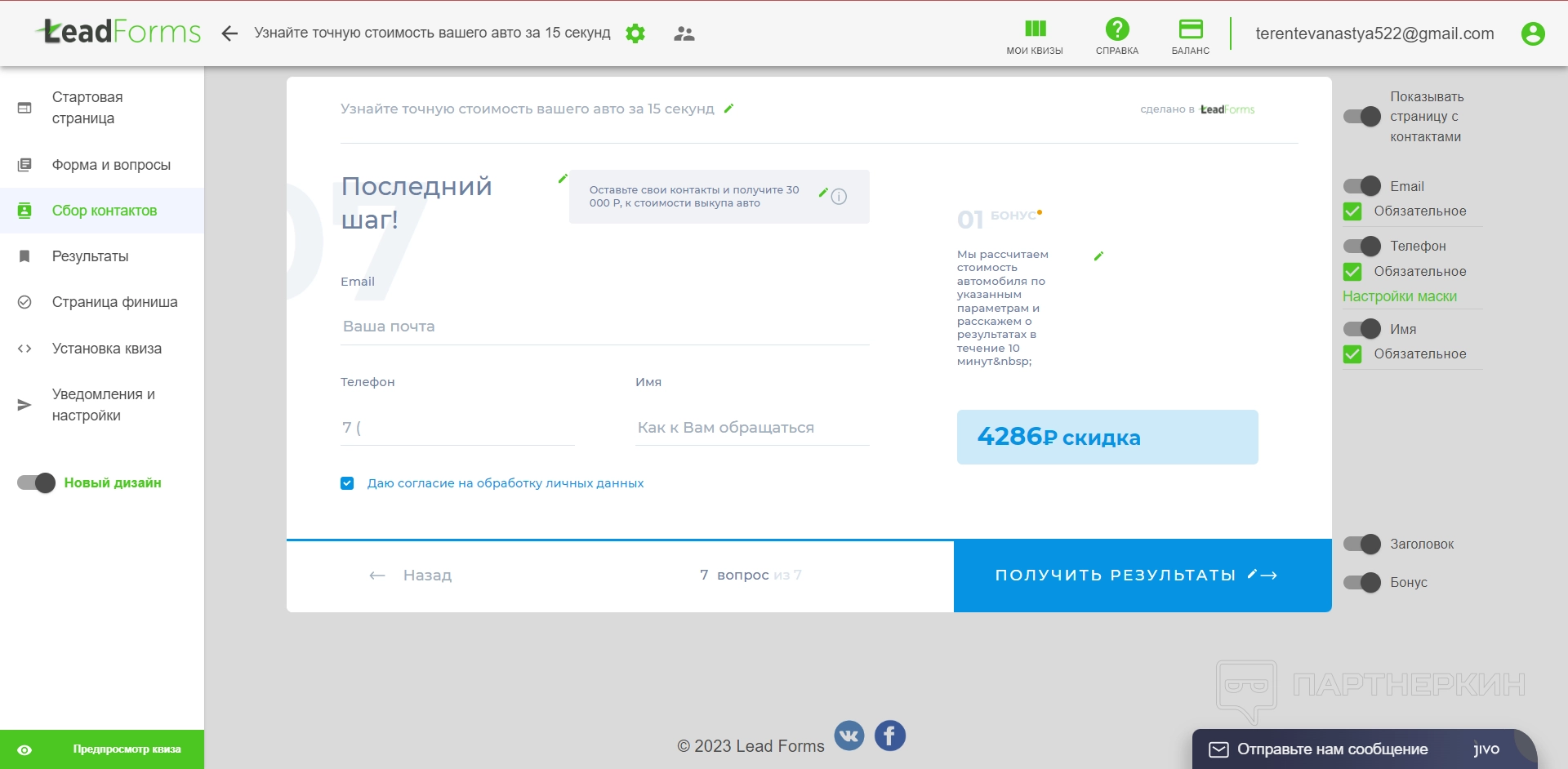 Последующая настройка происходит идентичным образом — пользователь может настроить отображение страницы сбора контактов и страницы финиша и результатов. При этом можно включить предпросмотр квиза, чтобы оценить, как его будут видеть клиенты.