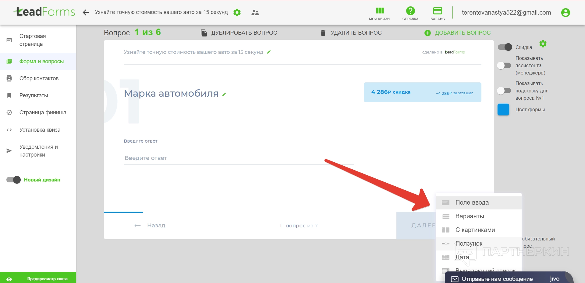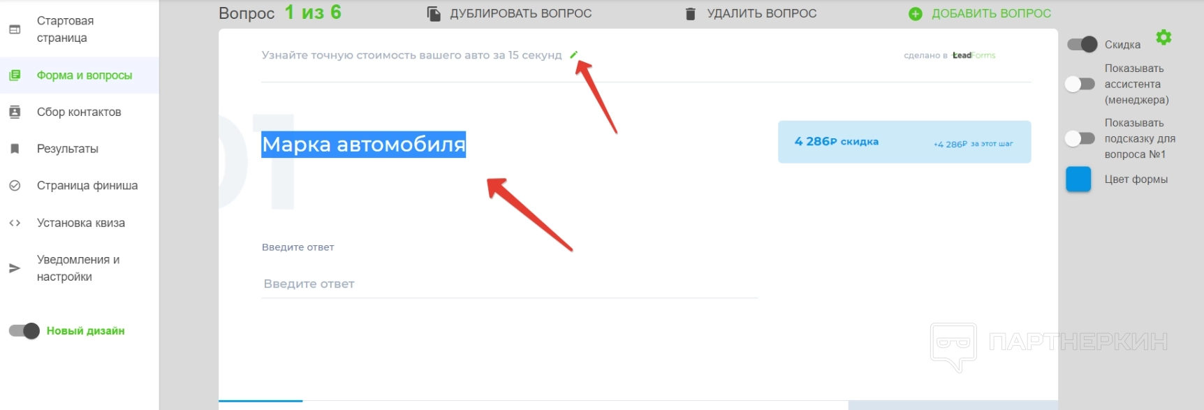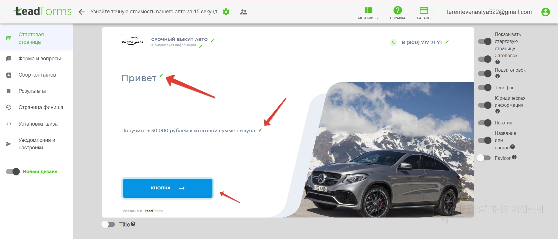 Как только шаблон будет выбран, пользователя перенаправят в конструктор — там уже происходит настройка квиза.