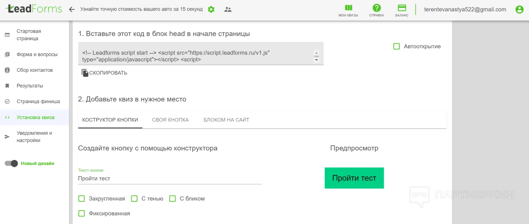По завершению достаточно перейти в раздел с установкой — там будет отображаться код для сайта самого квиза, а также код кнопки, которая будет вести на опрос. При этом кнопку можно оформить там же в нужном цвете и стиле.