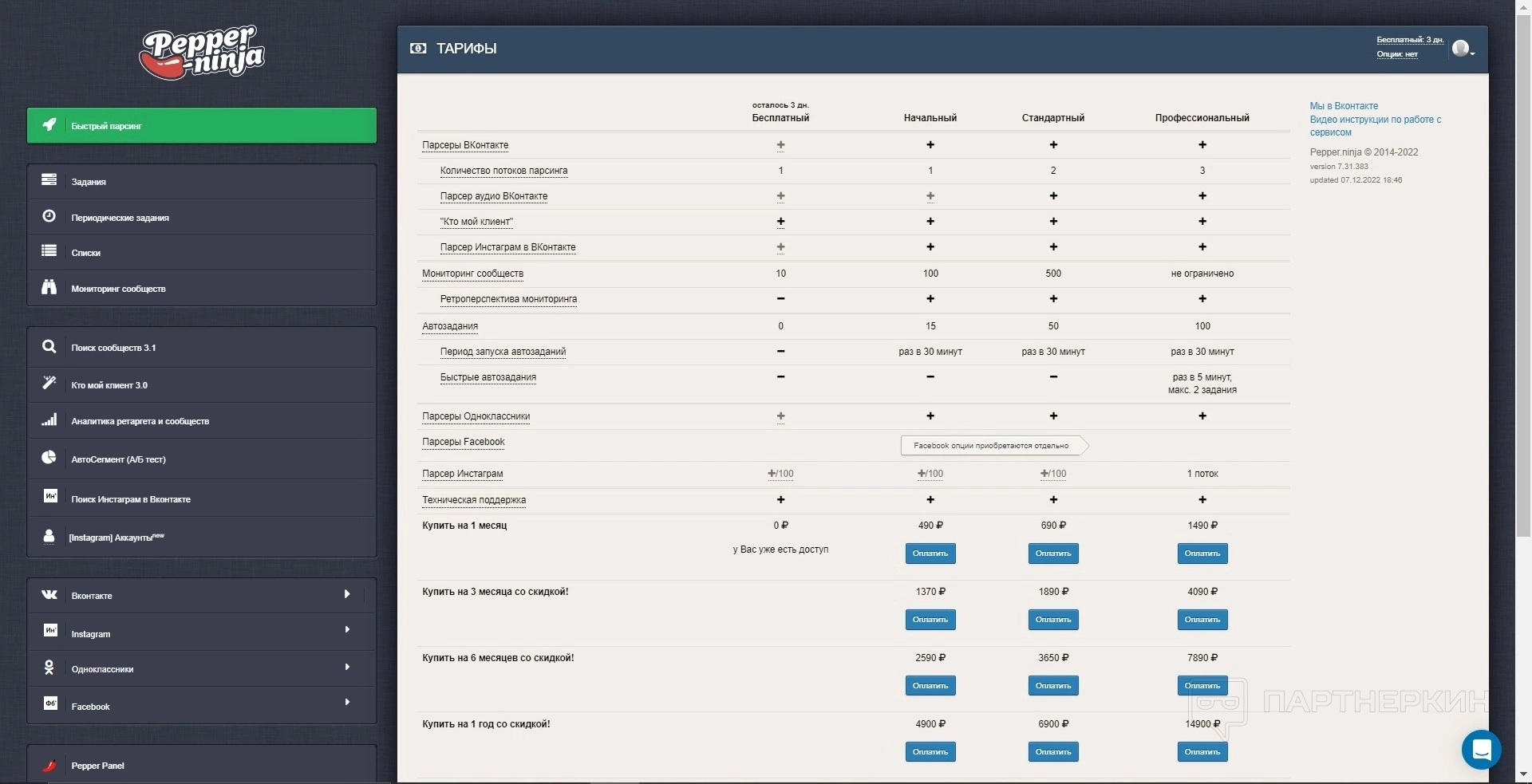 Нажимая на тарифы, пользователь попадает в соответствующий раздел, в котором можно приобрести тот или иной тариф для увеличения возможностей сервиса. Стоит отметить, что для социальной сети Facebook* инструменты приобретаются дополнительно:
