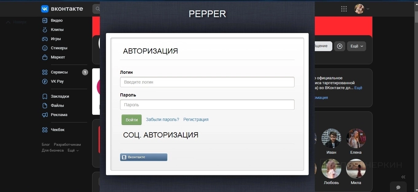 Далее пользователь заходит в свою учетную запись с помощью установленных логина и пароля или проходит авторизацию с помощью своего профиля ВКонтакте:
