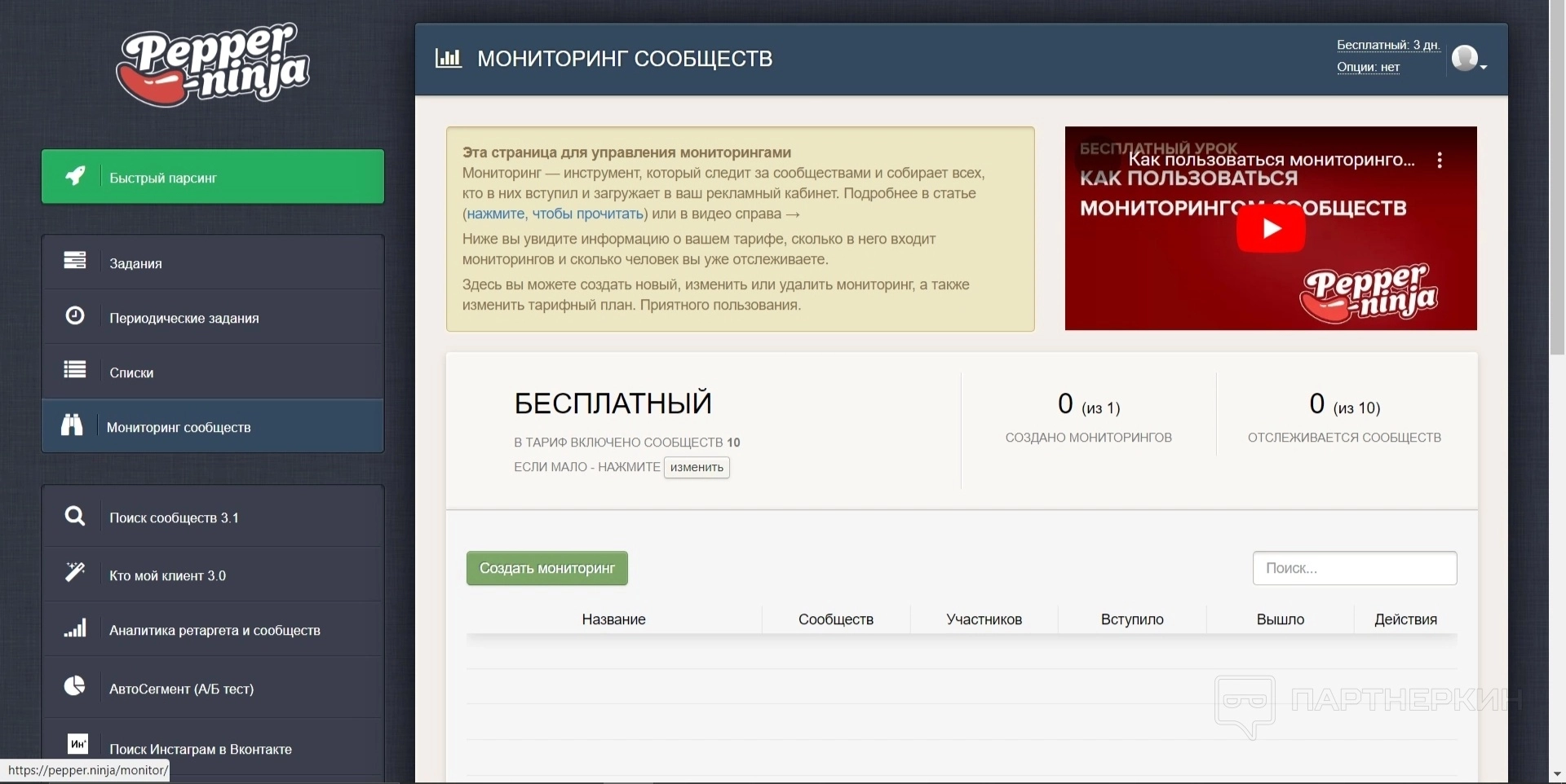 В мониторинге сообществ можно управлять любыми мониторингами и собирать необходимые данные. Например, на бесплатном тарифе можно создать и управлять всего одним мониторингом: