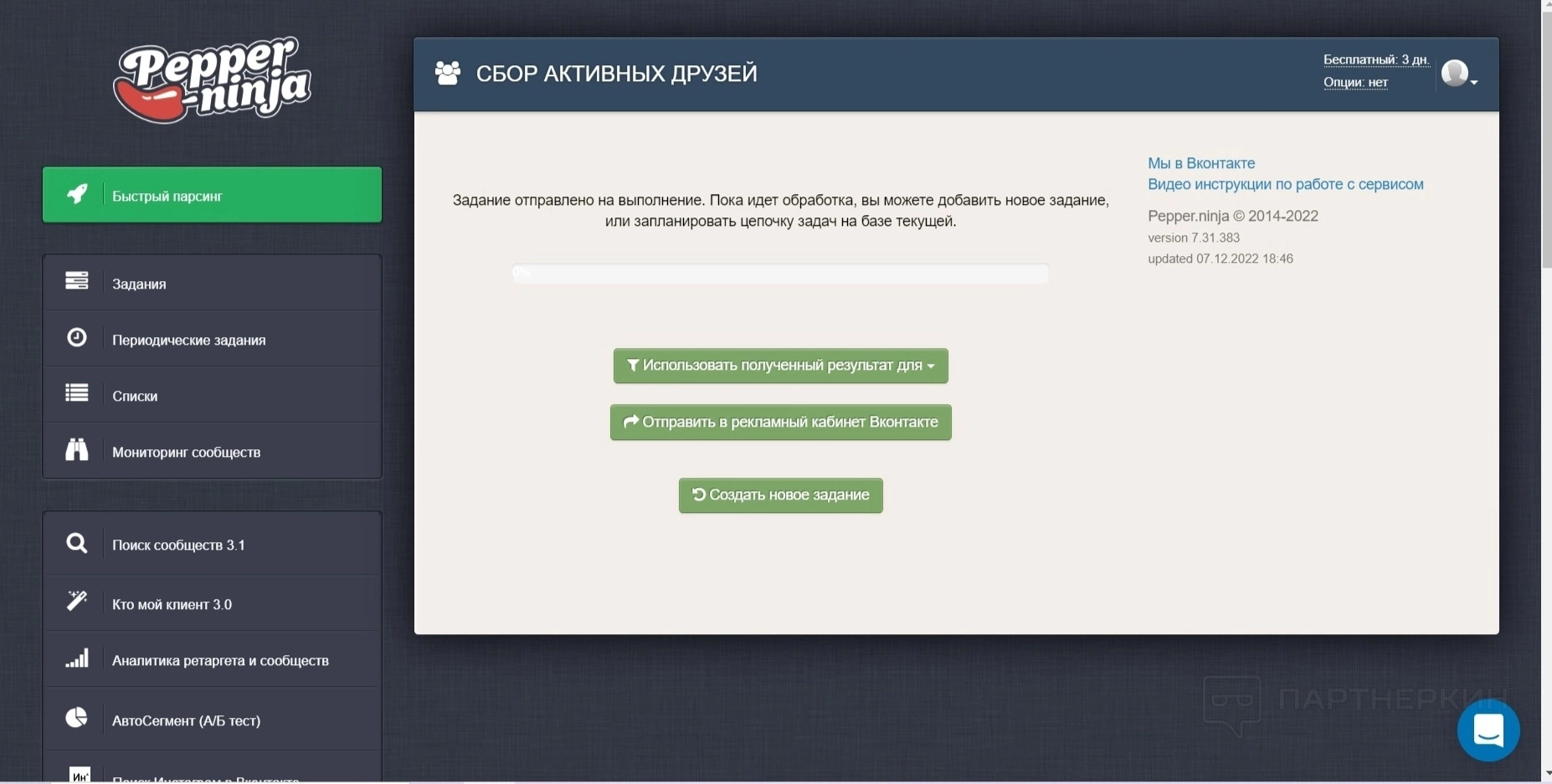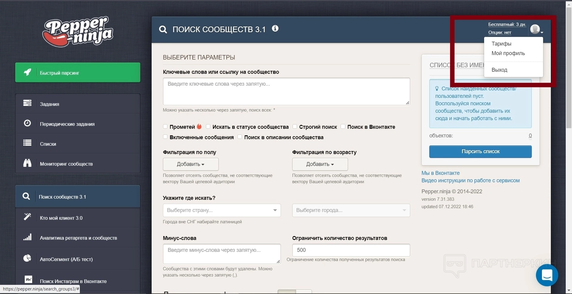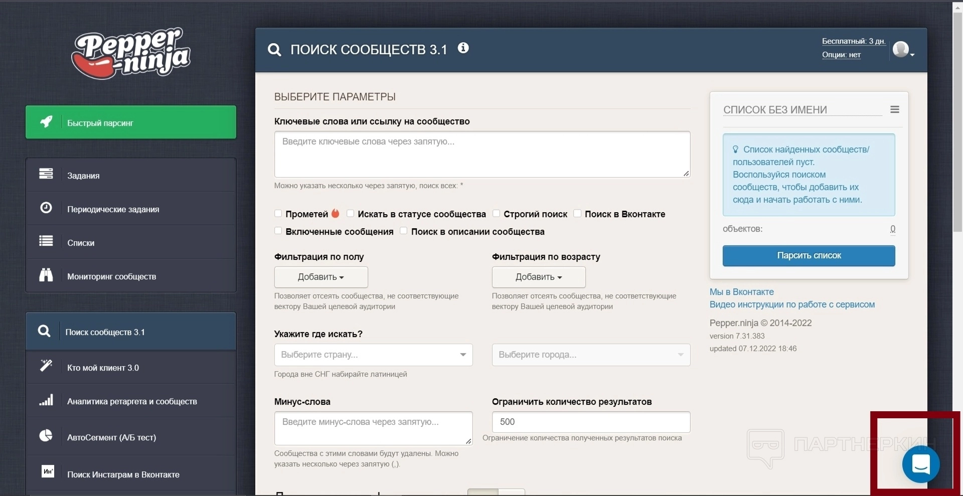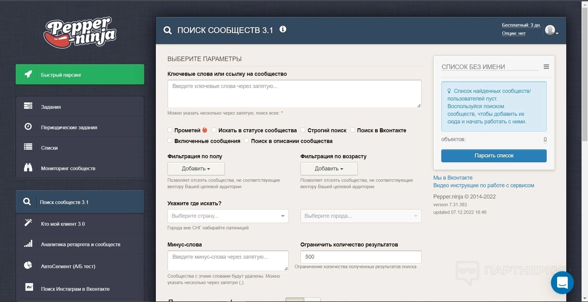Сервис сразу же предлагает запустить быстрый парсинг, поэтому главной страницей является страница настроек параметров для поиска сообществ.