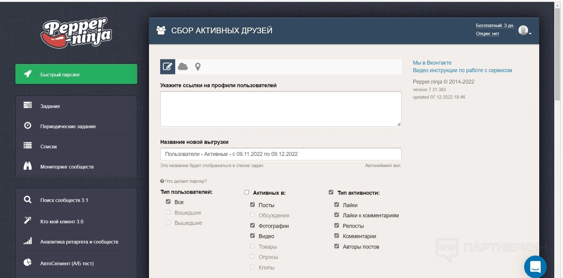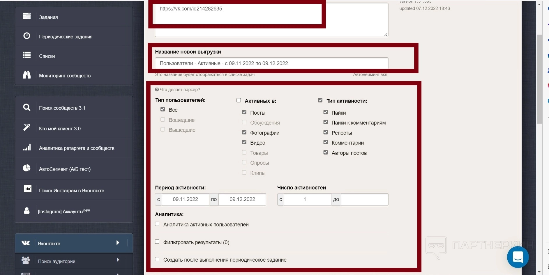 Далее настраиваем необходимые параметры для парсинга. В случае с парсером по сбору активных друзей нужно указать ссылки, а также желаемые разделы для проверки на активность: