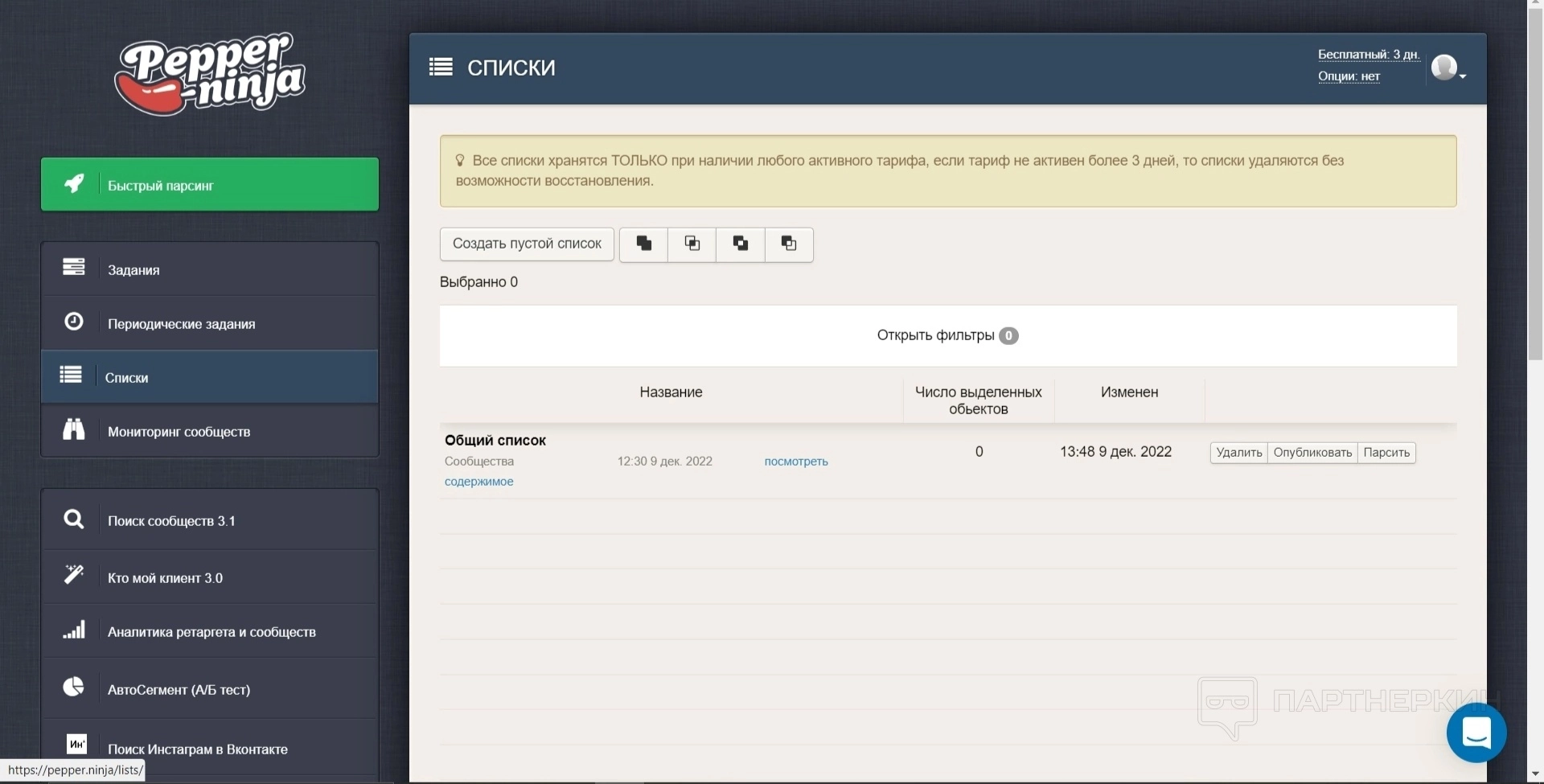Списки хранят в себе перечень всех собранных данных в парсинга, однако срок их хранения зависит от активности тарифа и профиля: если пользователь не заходит в данный раздел и не использует списки более 3 дней, они удаляются без возможности для восстановления.