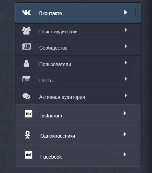 Для каждой из социальных сетей, с которыми работает сервис, есть свои инструменты. Для социальной сети ВКонтакте доступен самый большой набор инструментов, поскольку в каждом разделе собрано множество настраиваемых парсеров:
