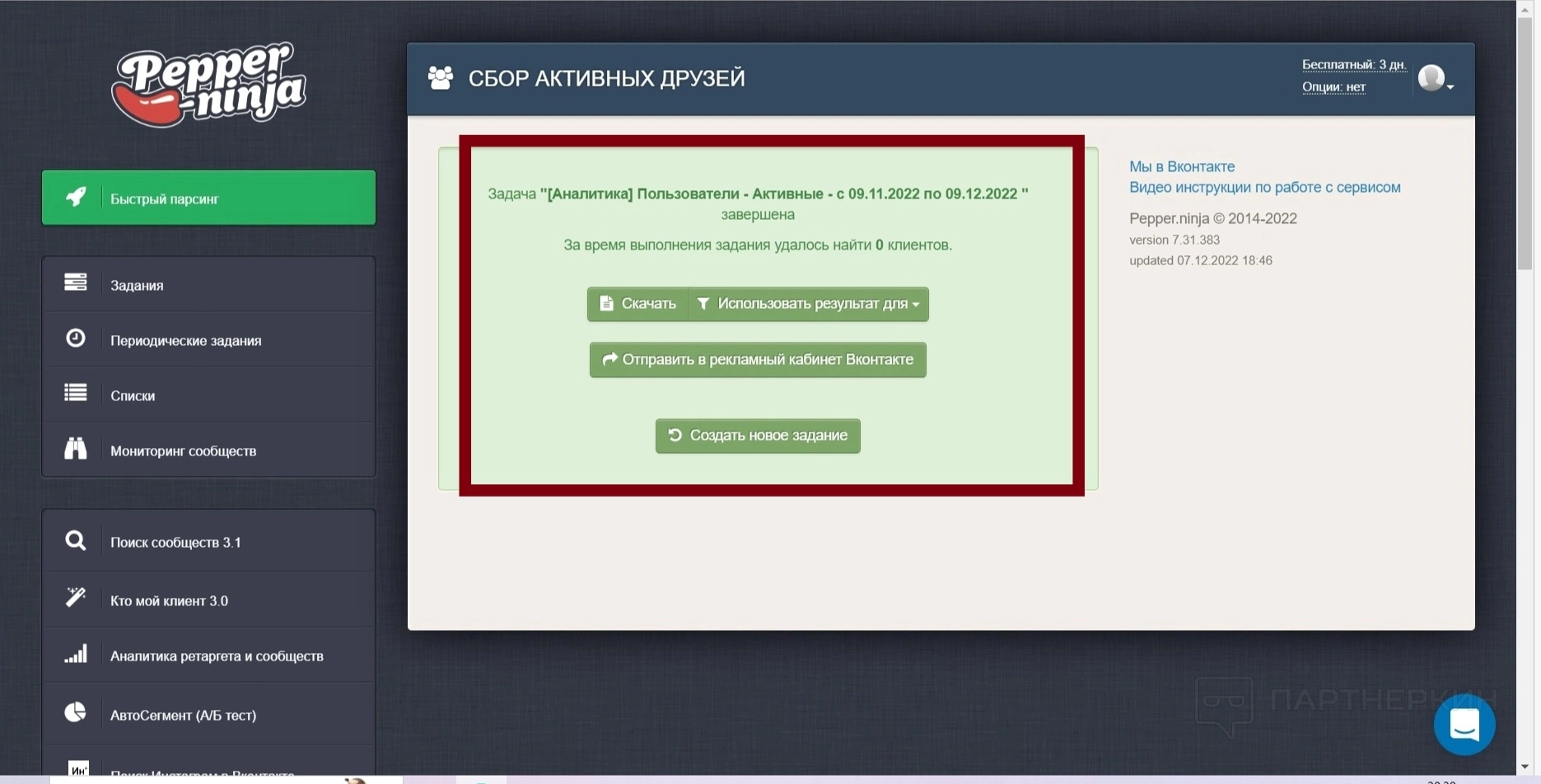 Как только сервис закончит выполнять задание, на экране высветится результат. Его можно отправить в рекламный кабинет, скачать или просто создать новое задание по другим параметрам: