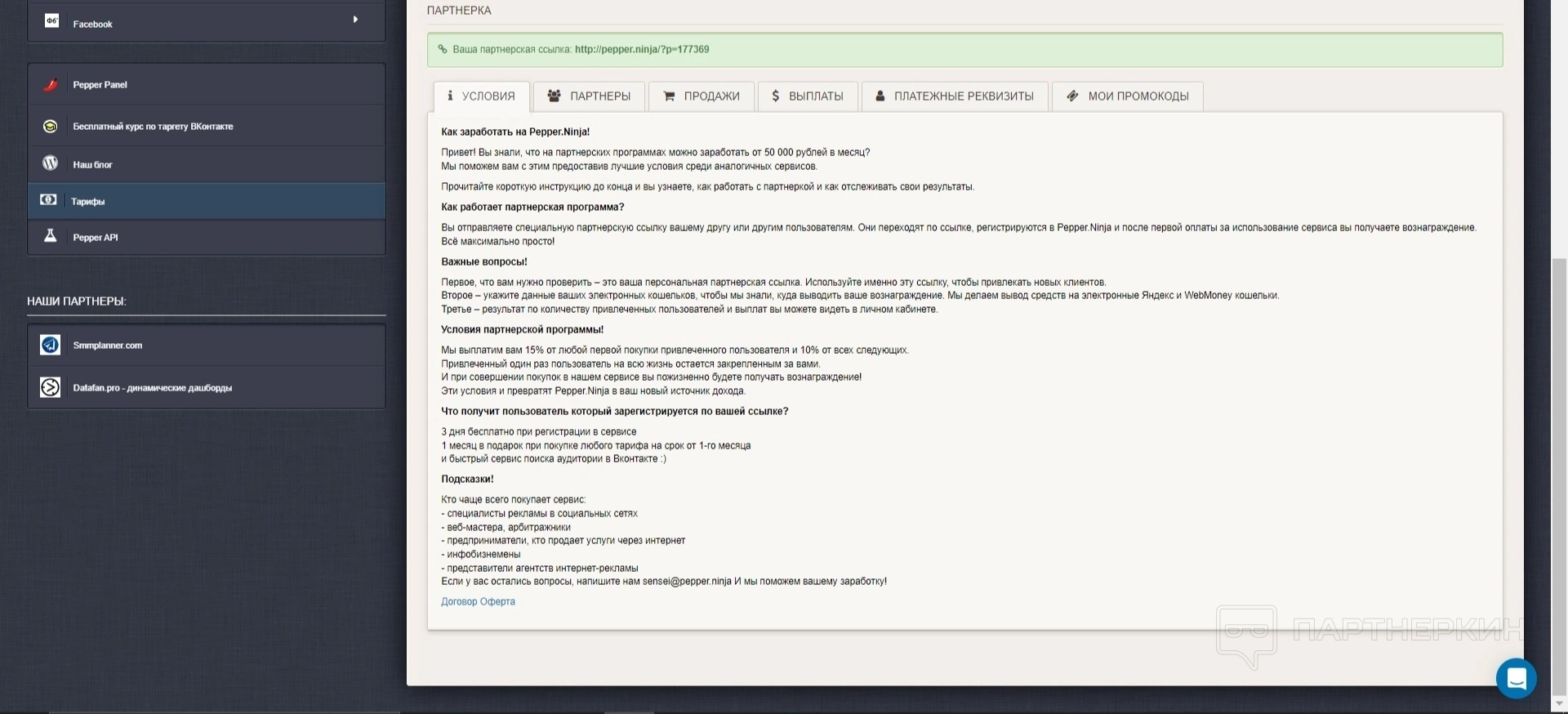 Здесь же в личном кабинете представлена информация о партнерской программе от