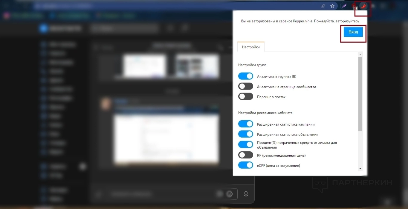 Если рядом со строкой поиска появляется значок расширения, что означает его успешную активацию. Также появляется небольшое меню, в котором можно настроить некоторые параметры, которые в дальнейшем будут отображаться при работе. Чтобы была возможность начать пользоваться всеми инструментами расширения, необходимо зайти в свою учетную запись