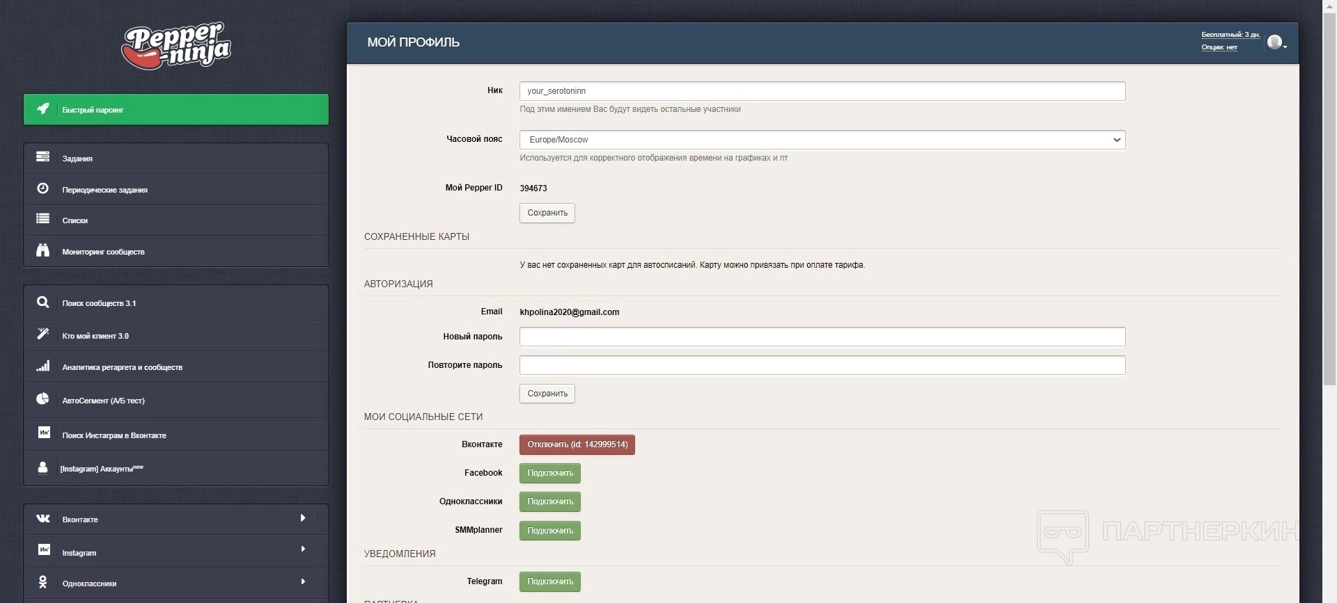 В личном кабинете можно настроить пароль, местоположение и другие стандартные настройки. Здесь же подключаются остальные социальные сети помимо ВКонтакте, а также можно настроить уведомления в Telegram: