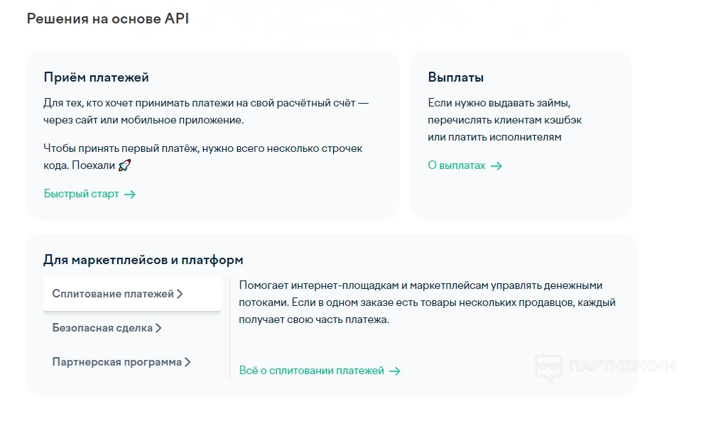На этой странице представлена информация о приеме платежей и выплатах. Пользователь узнает, что такое сплитование платежей, и как проходит безопасная сделка. В разделе подробно рассказывается о работе с API (как отправлять запросы и обрабатывать ответы).