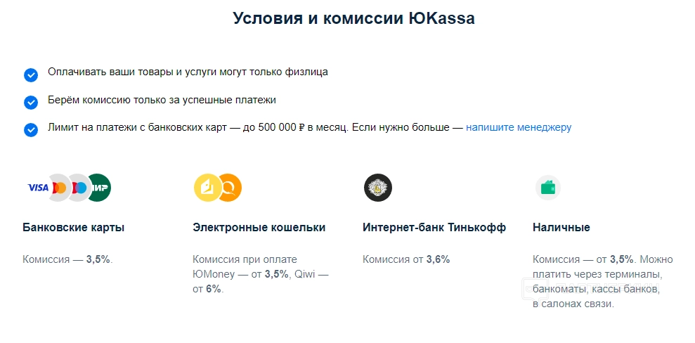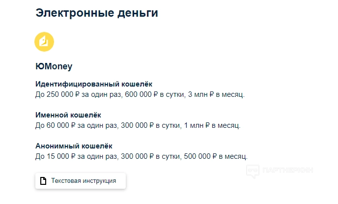 Для каждого способа действуют свои ограничения. На странице «Продукты» (раздел «Прием платежей») представлена подробная информация о каждом способе. Лимиты для кошелька ЮMoney выглядят так: