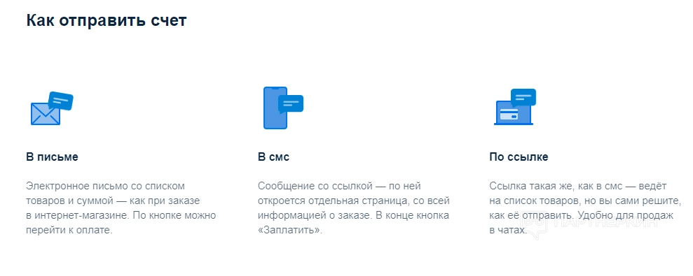 предлагает клиентам выставить счета прямо из личного кабинета (на сайте или в мобильном приложении). Счет создается за минуту и моментально отправляется покупателю, а пользователь следит за оплатой.
