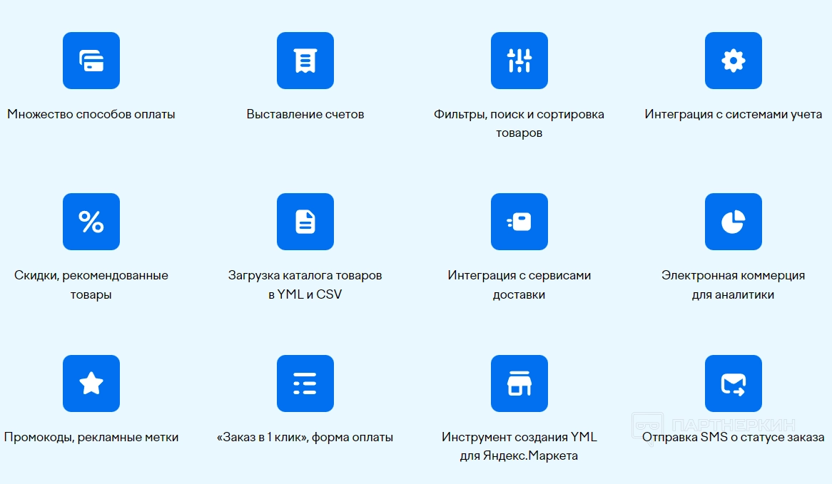 . Площадка предлагает множество инструментов для электронной коммерции и регулярно обновляет функционал. Платформа подойдет для небольших и крупных интернет-магазинов, а также для других проектов.