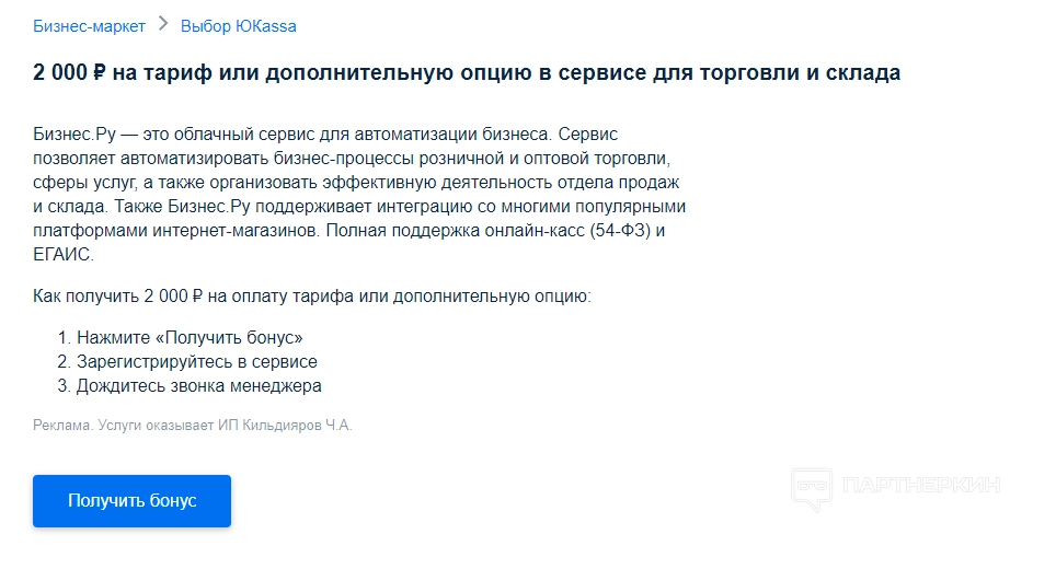 У каждого сервиса находится кликабельная ссылка по кнопке «Узнать». Например, карточка Бизнес.ру выглядит так: