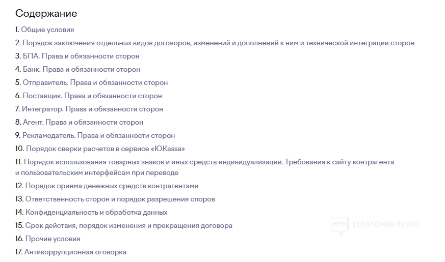 На этой странице пользователь может посмотреть, к какому типу относится его организация. Доступно несколько блоков: для поставщиков, агентов, банковских платежных агентов, банков, интеграторов, отправителей и рекламодателей. Внутри каждого раздела находятся ссылки на правила и приложения к ним. Содержание выглядит так: