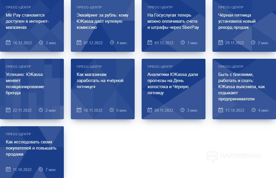Пользователь может подробно ознакомиться с разделами «Компания» и «Поддержка». Например, в пресс-центре находятся последние статьи сервиса: «Как магазинам заработать на Черной пятнице», «Эквайринг за рубль: кому