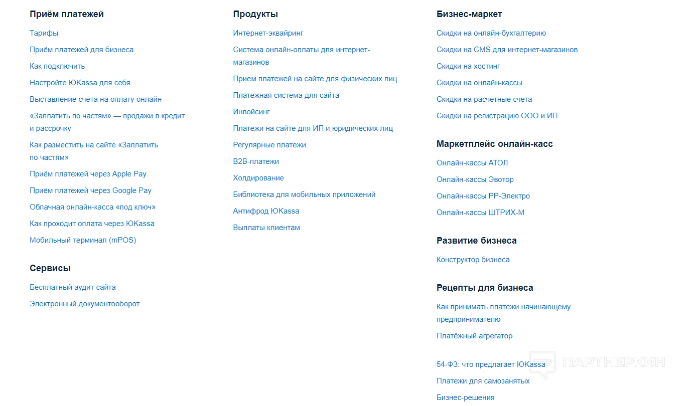 В разделе находится семь категорий: прием платежей, сервисы, продукты, бизнес-маркет, маркетплейс онлайн-касс, развитие бизнеса, рецепты для бизнеса. Пользователь выбирает необходимый раздел и переходит в него.