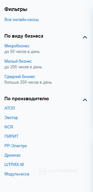 В левом боковом меню находятся фильтры: по виду бизнеса и по производителю.