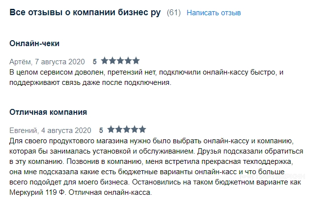 На странице есть описание, что представляет из себя сервис Бизнес.ру. Внизу находятся отзывы пользователей:
