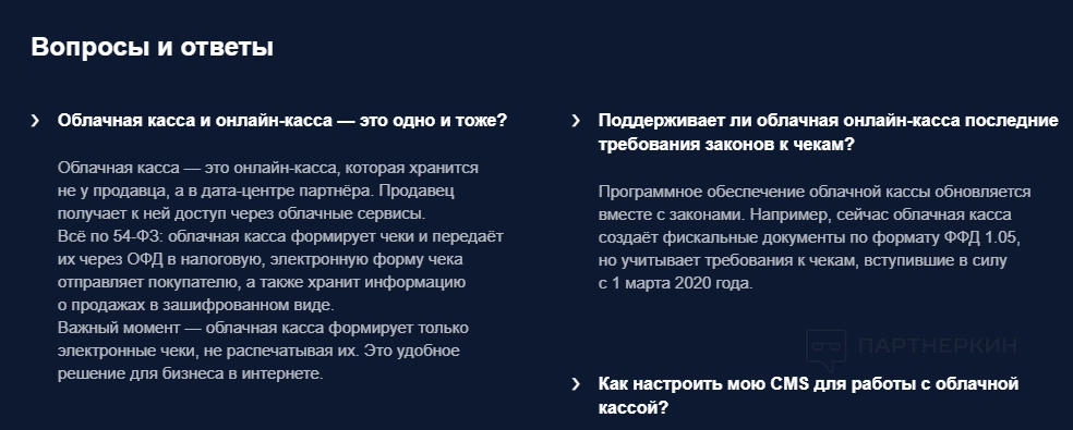 Внизу страницы находится раздел с вопросами и ответами, который выглядит так: