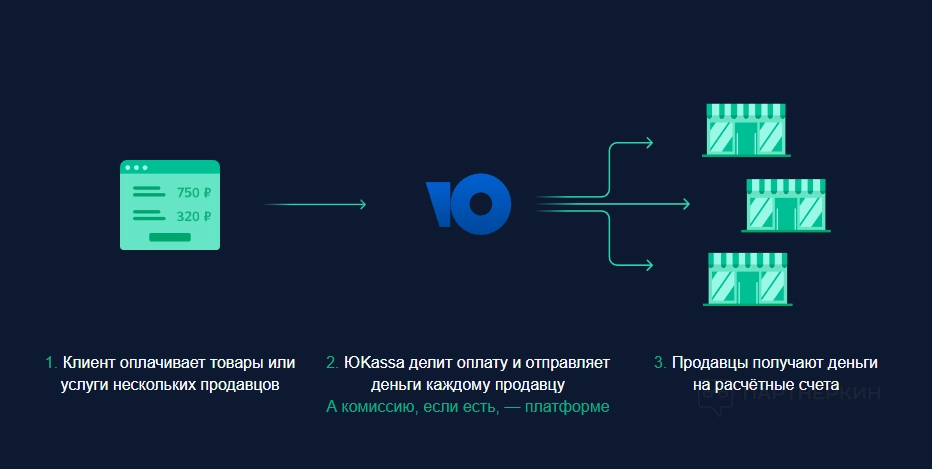 помогает маркетплейсам, агрегаторам, франшизам и сервисам доставкам еды управлять денежными потоками. Покупатель оплачивает товары или услуги, а площадка отправляет одному или нескольким пользователям необходимую сумму.