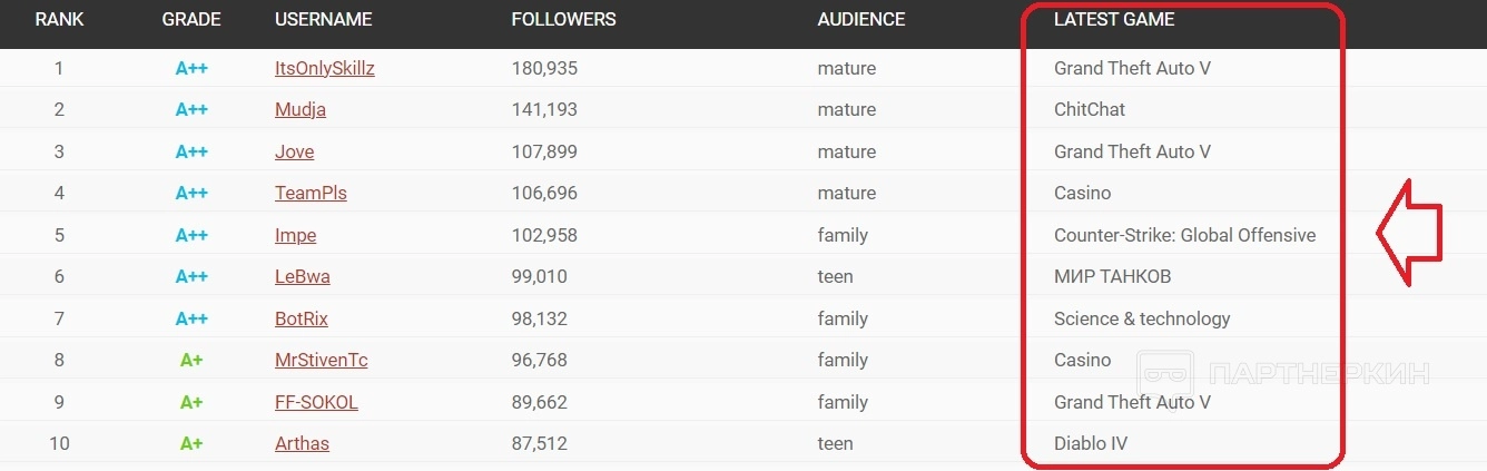 Если воспользоваться вкладкой Twitch, можно понять тренды в сфере самых популярных игр. На первых местах — Fortnite, Diablo IV, League of Legends. Если заказчик желает продвигать свой канал с похожими играми, он может получать информацию о статистике конкурентов с помощью