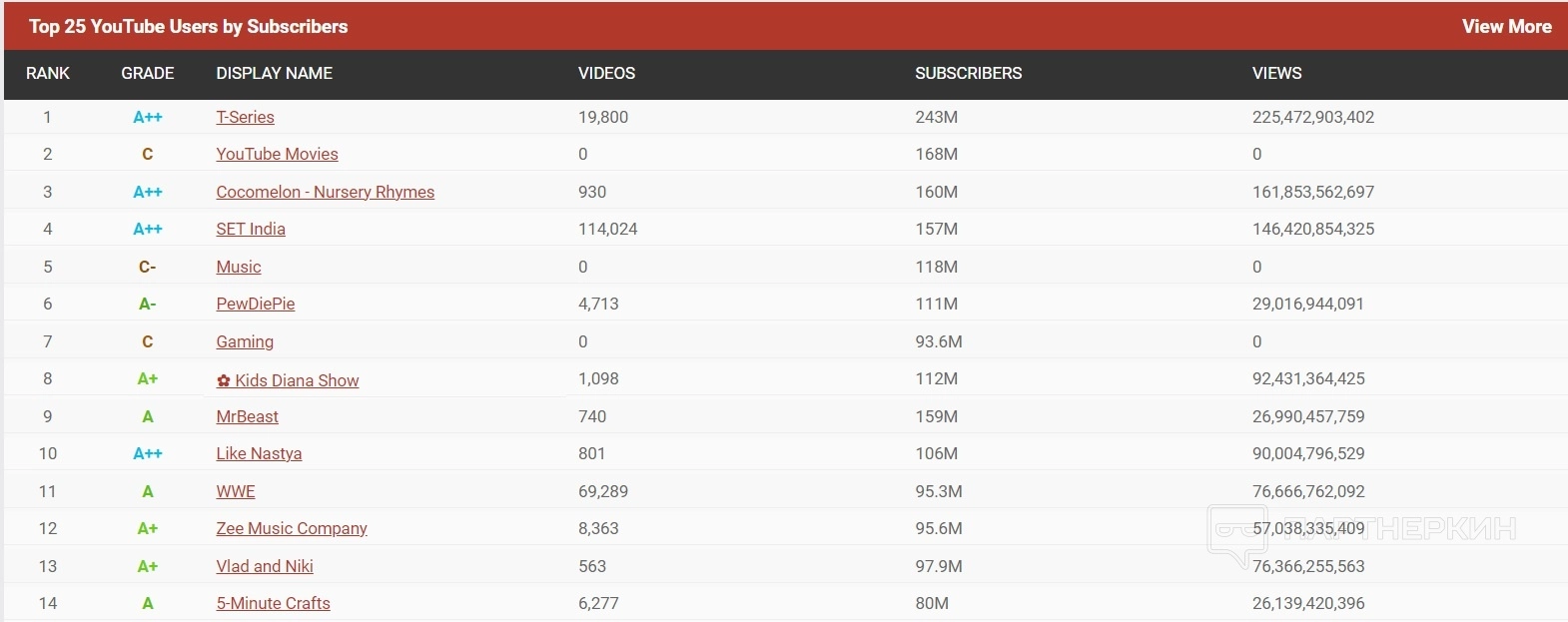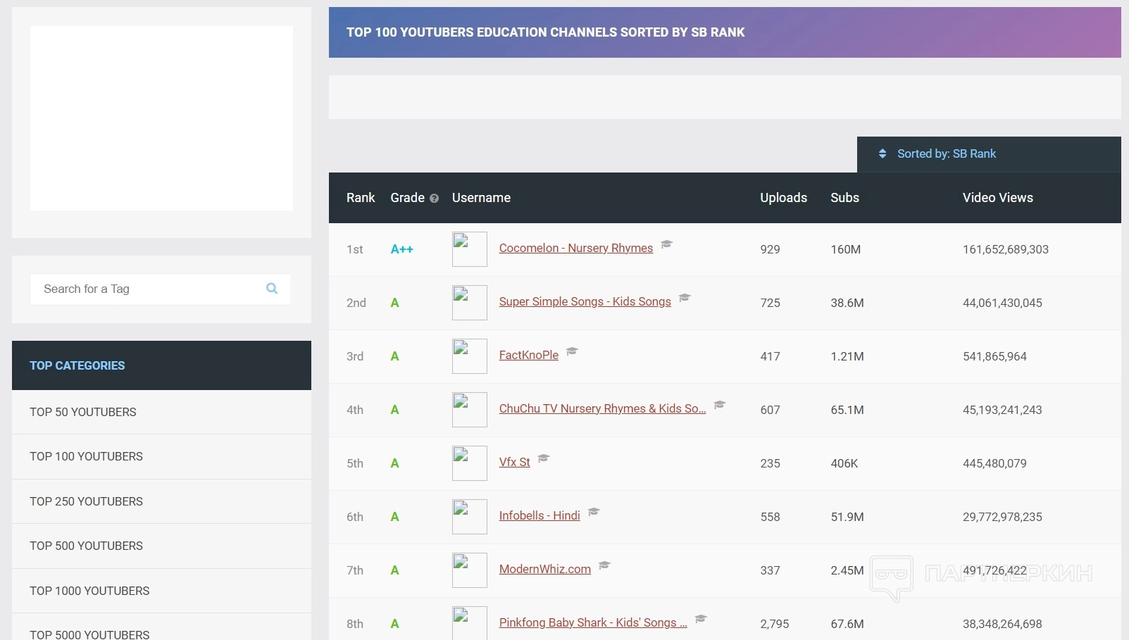 Например, зайдя на вкладку YouTube, можно узнать, на каких каналах больше всего подписчиков и просмотров, какова их тематика, что сейчас в целом в тренде на рынке, что аудитория любит смотреть, на кого любит подписываться. Эти данные можно задействовать в своем продвижении. Например, выводится рейтинг по топ-25 ютуберов и каналов по количеству подписчиков.