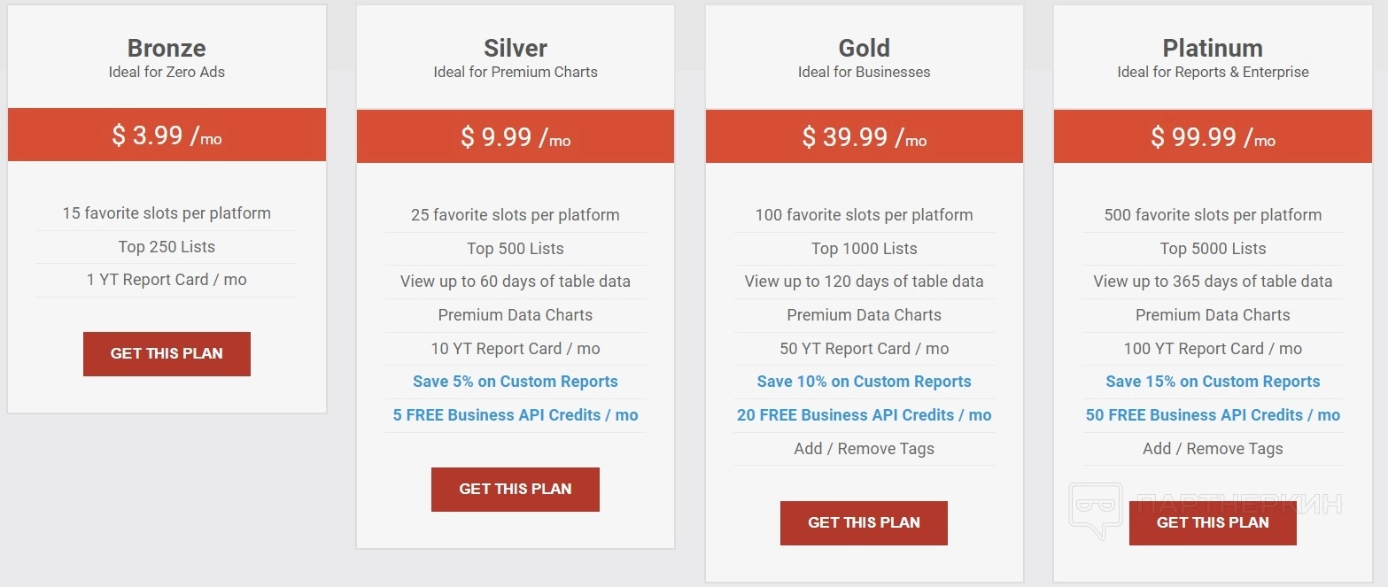 - Бронза — $3,99 / мес. Включает 15 любимых слотов на платформу, 250 лучших списков, 1 табель успеваемости YT / мес.