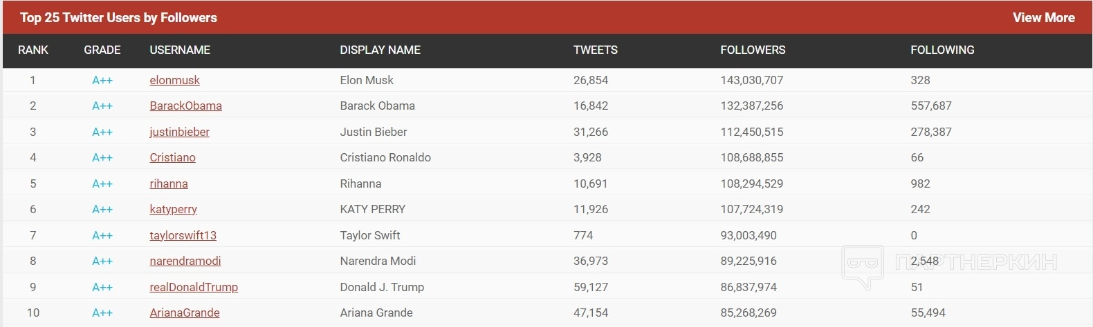 Во вкладке Twitter можно оперативно проанализировать аккаунт любого человека, узнать, сколько у него подписчиков и каков его рейтинг. Самые популярные в мире аккаунты Twitter у Илона Маска, Барака Обамы, Джастина Бибера и Криштиану Роналду.