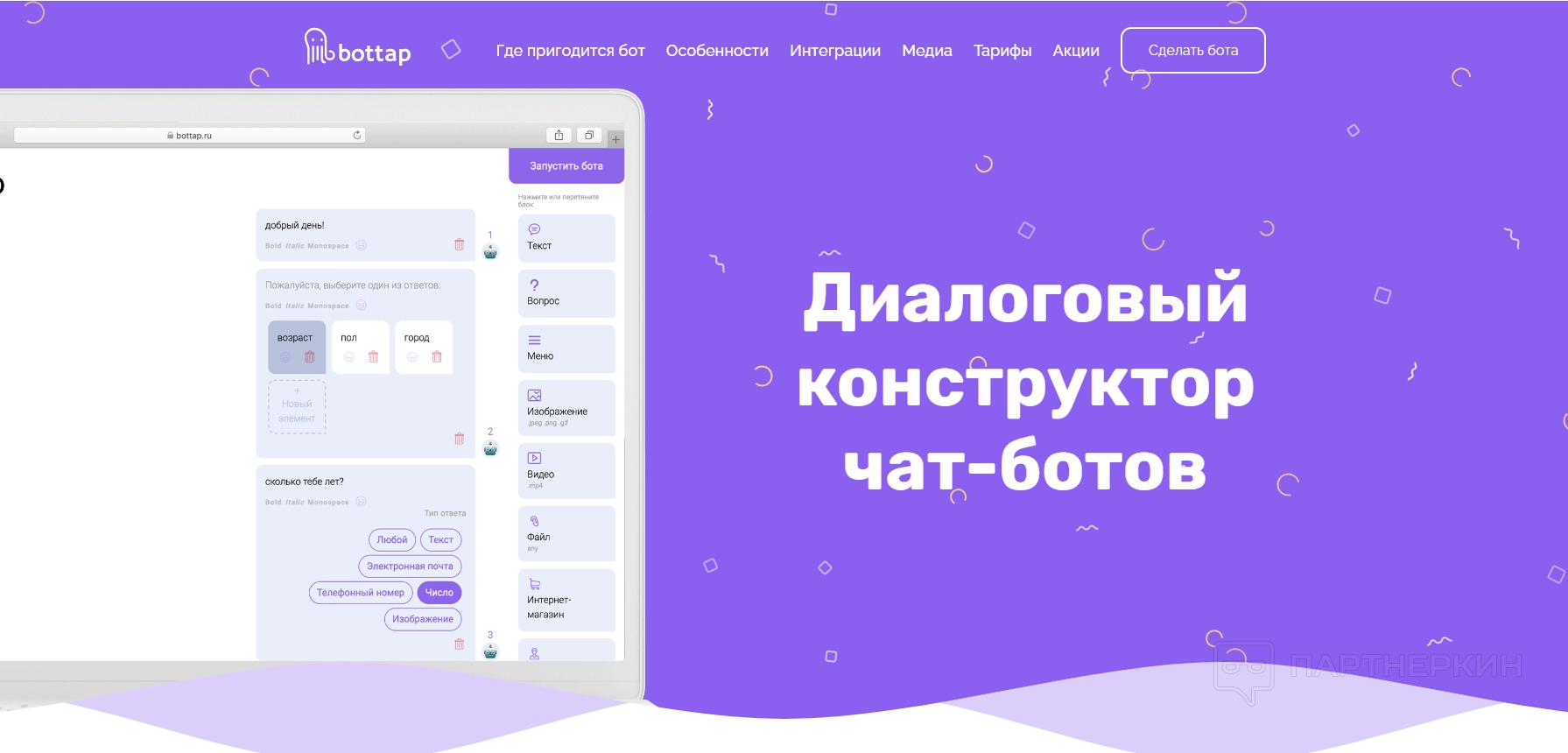Для того, чтобы начать работу с конструктором, необходимо перейти на официальный сайт проекта (https://bottap.ru/) и нажать на кнопку «Сделать бота». В целом, на лендинге ничего интересного больше нет — кому пригодится бот, что он умеет делать, и во сколько это обойдется.