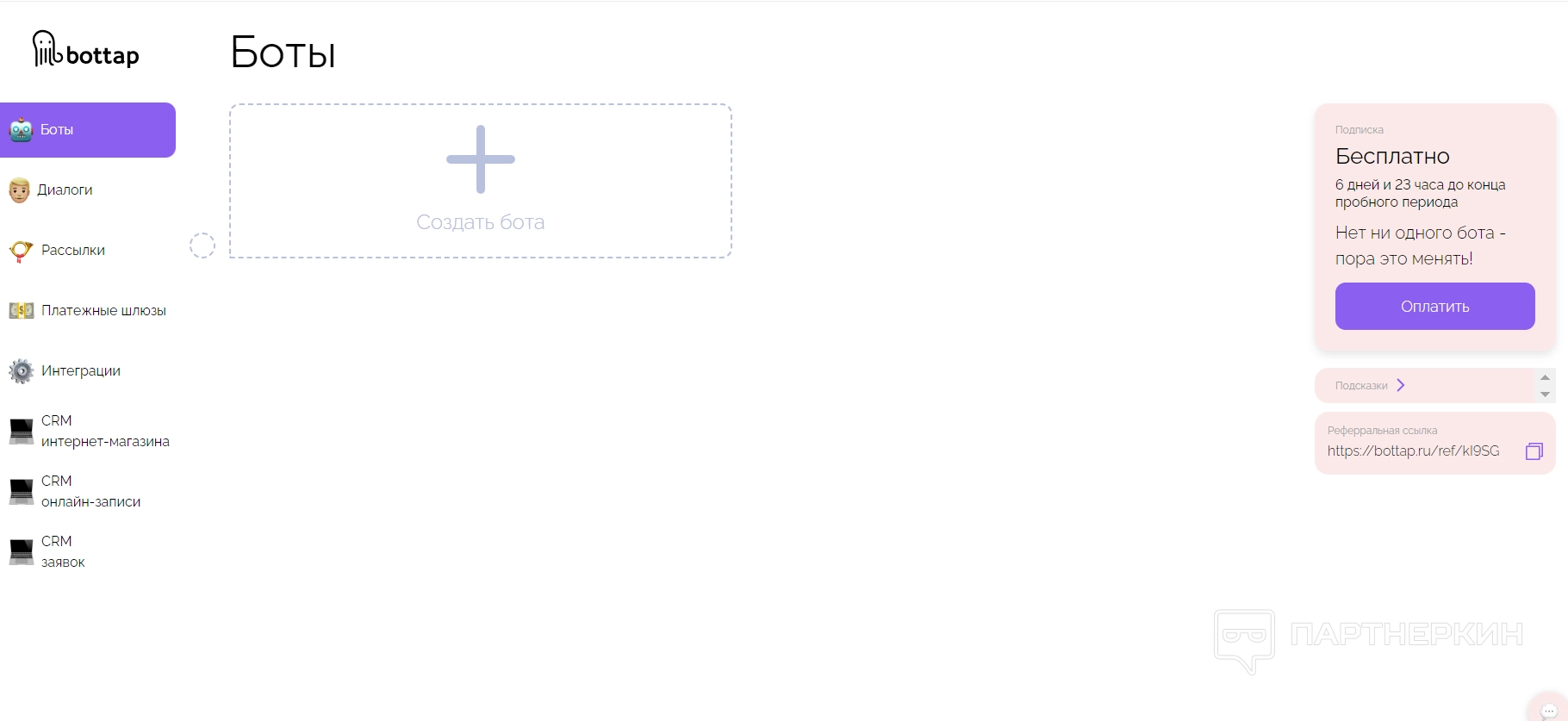Подтверждать ничего не потребуется — сразу после ввода данных пользователь получит доступ к рабочему полю, при этом появятся сообщения-обучение по функционалу. Начиная с этого момента у разработчика будет ровно неделя на тестирование, после этого придется оплачивать минимальный тариф. Кстати, на проекте действует реферальная программа, благодаря которой можно немного уменьшить сумму платежа.