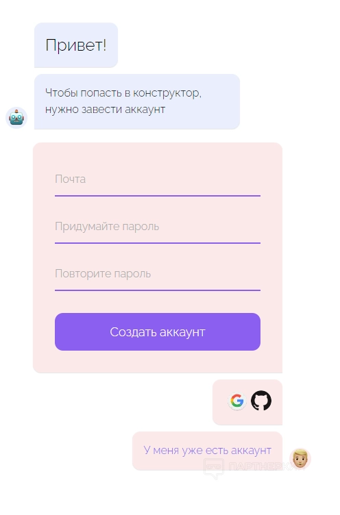 Вся работа с ботом построена в виде диалога — не нужно перетаскивать блоки и соединять между собой, разработчики заранее позаботились о том, чтобы от пользователя требовалось только вводить значения в шаблон.