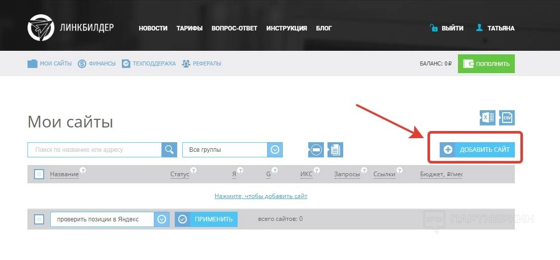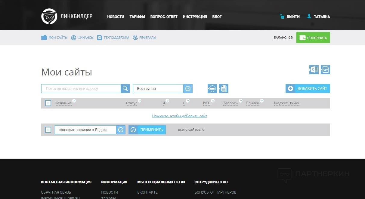 - Мои сайты . Здесь добавляются веб-ресурсы, которые при необходимости можно группировать. Также в этом разделе располагаются инструменты для проверки позиций в поисковиках, отслеживание индекса качества, поисковые запросы.