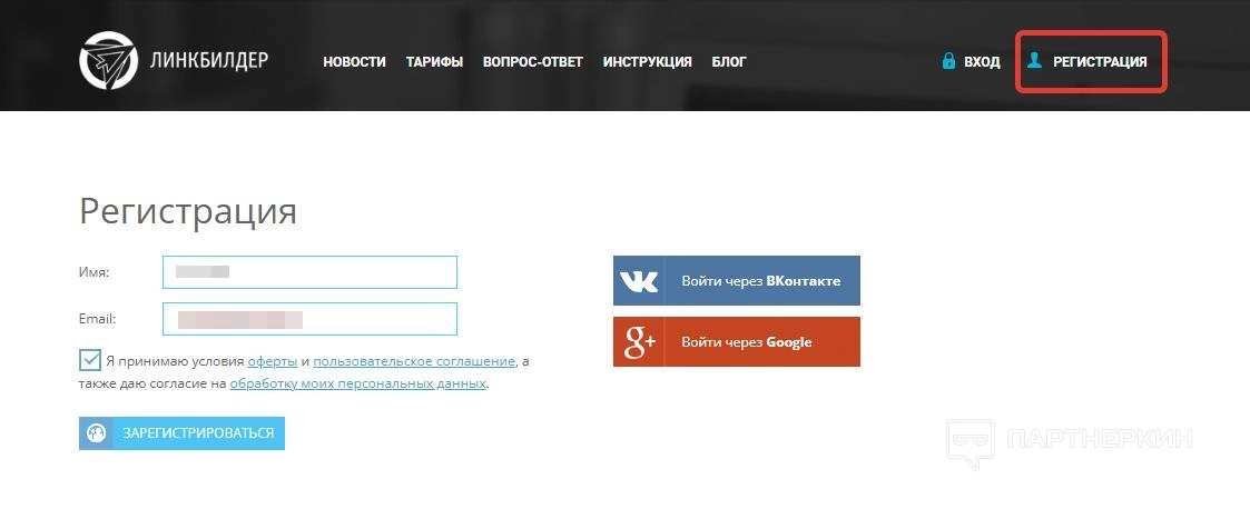 Чтобы заказать услугу на платформе, требуется создать личный кабинет. Для этого найдите пункт «Регистрация» в верхнем меню сайта, укажите имя и email. Также можно совершить быстрый вход через ВКонтакте или Google.