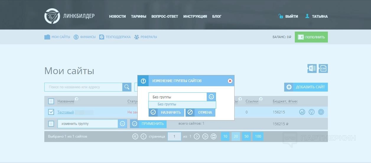 Сайты можно сортировать по группам. Для этого выделите нужные позиции, в меню опций под табличкой выберите вариант «Изменить группу» и нажмите «Применить». Появится окошко, в котором нужно указать папку либо создать новую директорию. Эта опция будет полезна тем, кто продвигает несколько сайтов по разным запросам или тематикам.