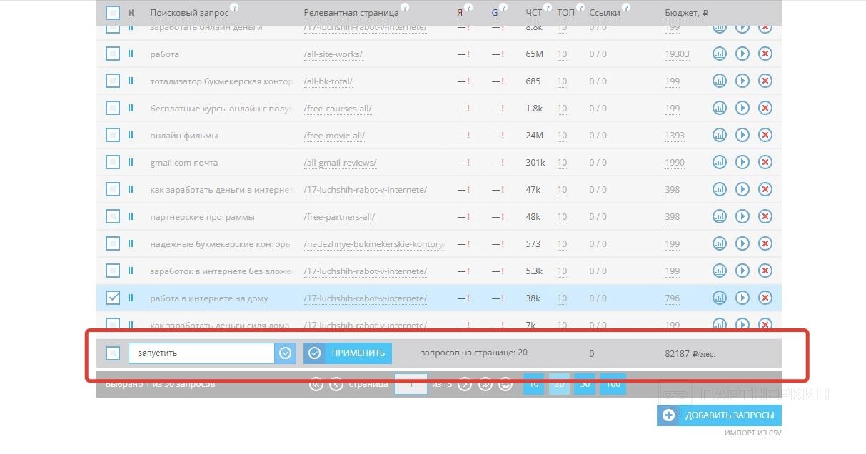 Чтобы работать с выбранным запросом, выделите его галочкой и прокрутите страницу вниз. Под таблицей находится панель с дополнительными инструментами и отображается общий бюджет продвижения сайта по всем запросам и ссылкам.