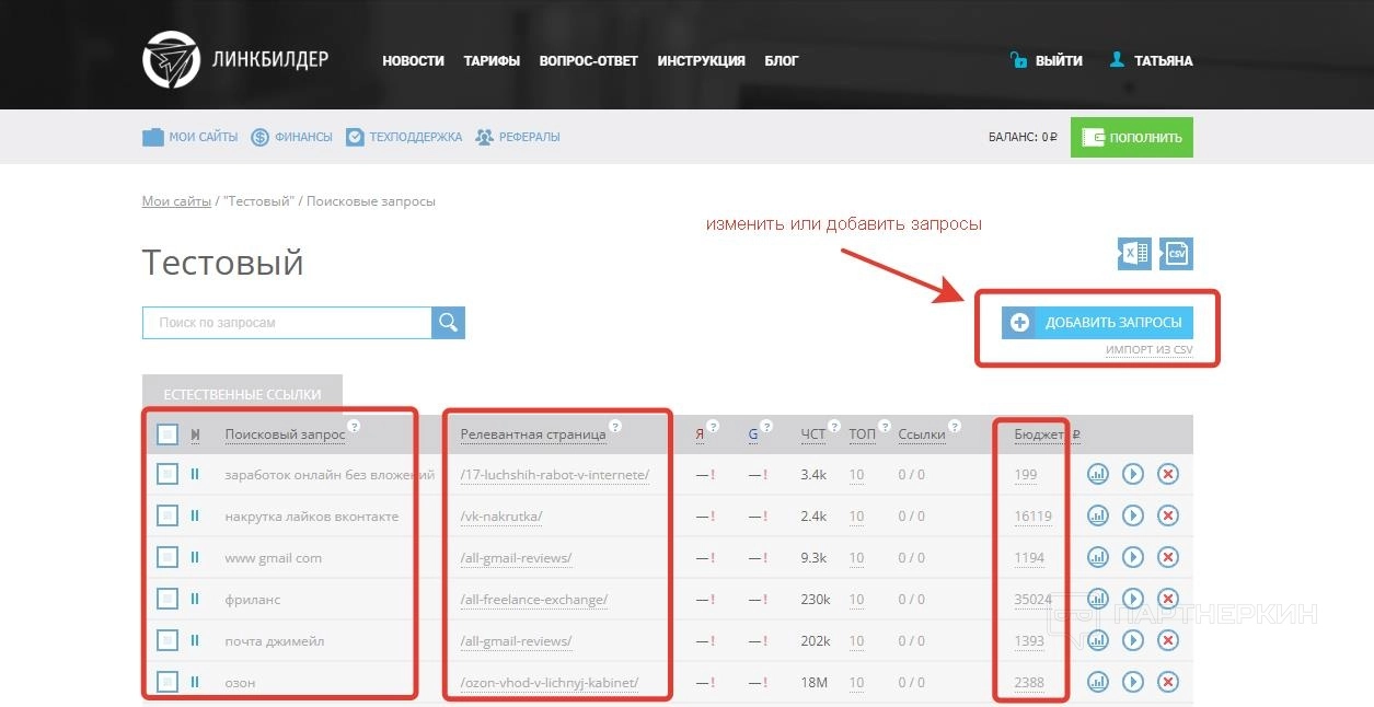 - запустить запрос в работу – отправить поисковой ключ и привязанную к ней ссылку на продвижение;