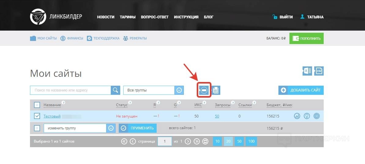 Еще одна полезная опция – добавление доноров в черный список. Это требуется для того, чтобы сервис не размещал ссылки на веб-площадках, которые по какой-то причине вам не подходят. Чтобы забанить сайт, кликните по иконке минуса, который располагается над табличкой.