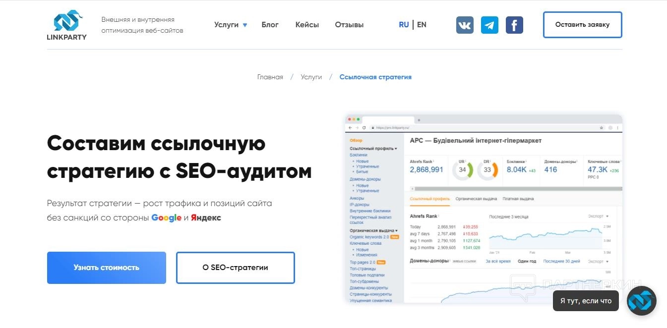 Ссылочная стратегия . С помощью сервиса можно получить стратегию продвижения через ссылки, которая гарантирует рост трафика без санкций со стороны поисковых систем. Для этого проводится глубокий анализ конкурентов, исправляются технические ошибки и создается список страниц, требующих продвижения.