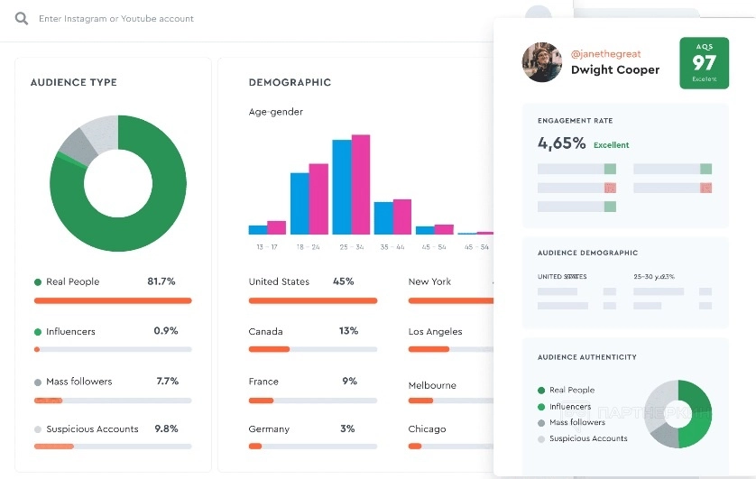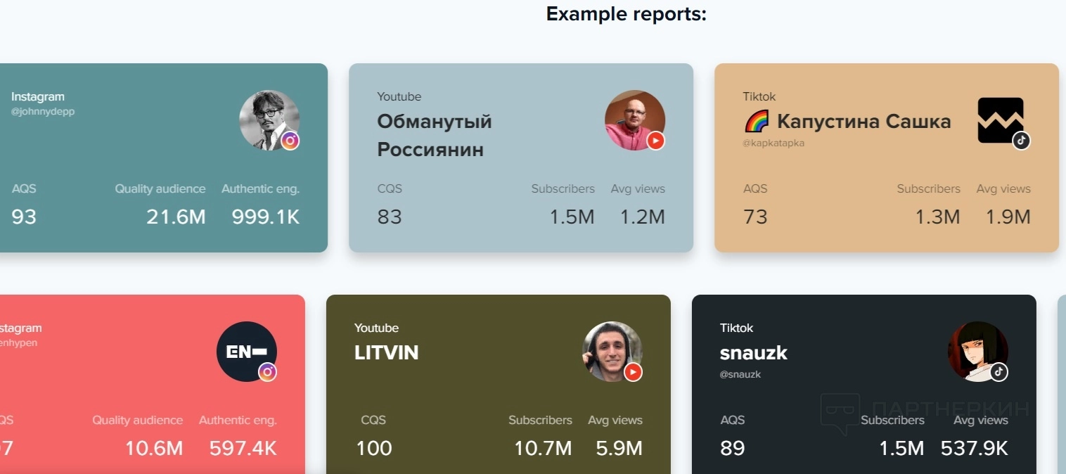 Сервис предоставляет углубленные отчеты по любой учетной записи одной из популярных соцсетей. В отчетах отражаются данные по АКС, CQS, проценту качественной аудитории, количеству просмотров, подписчиков. Можно проверить более 1 000 бесплатных отчетов ведущих влиятельных лиц в Top Rankings.
