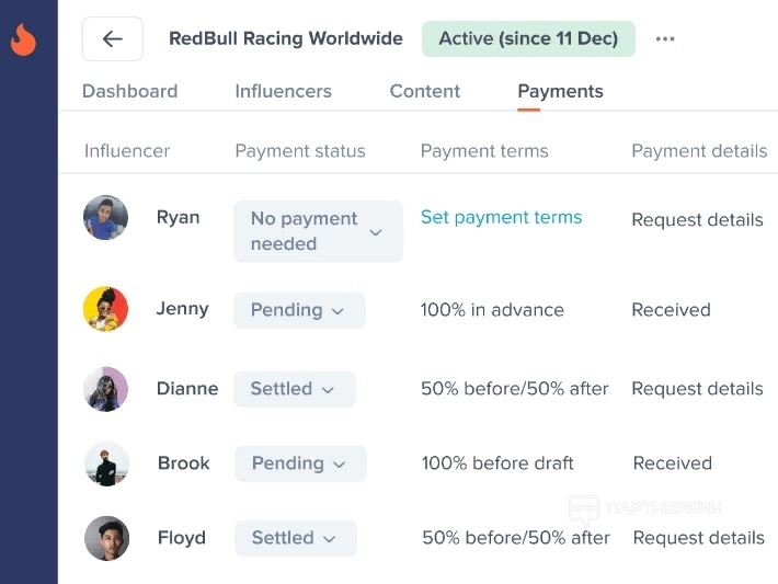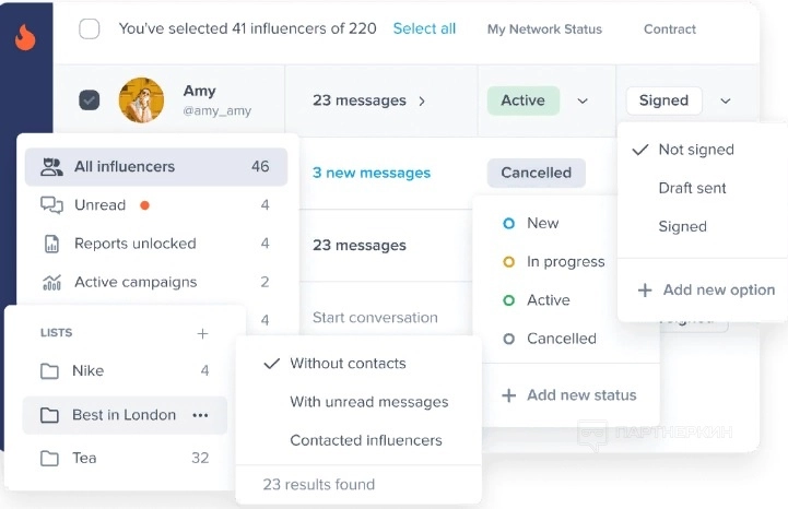 - Возможность отслеживать прогресс и результаты на каждом этапе жизненного цикла кампаний Influence-маркетинга.