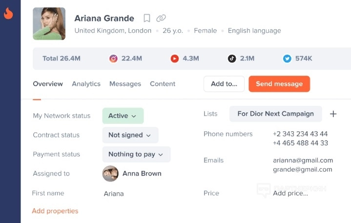 Сообщение можно персонализировать, чтобы повысить шанс на отклик. Можно использовать имена блогеров, ссылки на профили. Можно быстро добавить инфлюенсеров в свой список рассылки прямо из