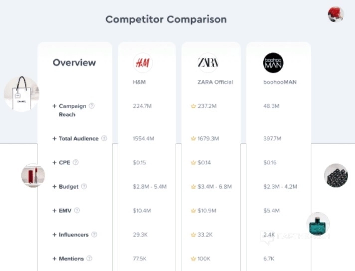 - Анализ конкурентов . Решения для конкурентного анализа показывают, как проходят кампании у конкурентов. HypeAuditor дает список блогеров, с которыми работают конкуренты, действует как spy-сервис — показывает креативы и дает данные об используемых маркетинговых бюджетах.