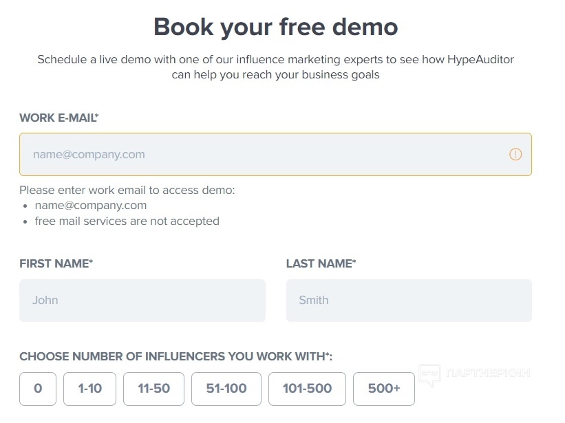 У HypeAuditor есть бесплатная пробная версия. По желанию клиент может заказать демо-доступ. Для заказа демонстрации нужно ввести адрес корпоративной электронной почты, свое имя, количество блогеров, с которым компания планирует работать, должность. Можно заказать телефонный звонок.