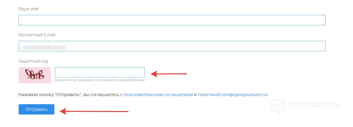 В конце вводим защитный код и жмем кнопку «Отправить».