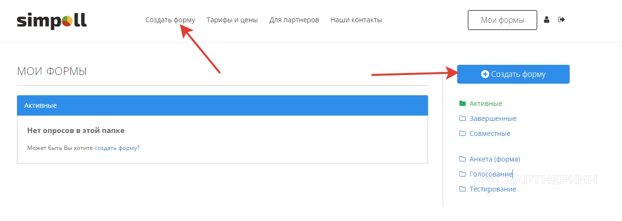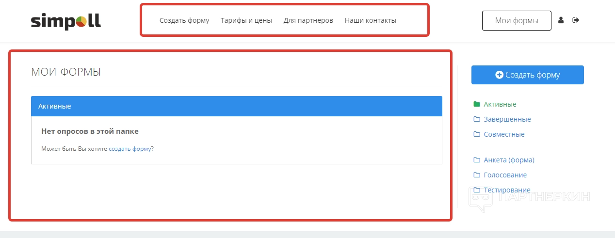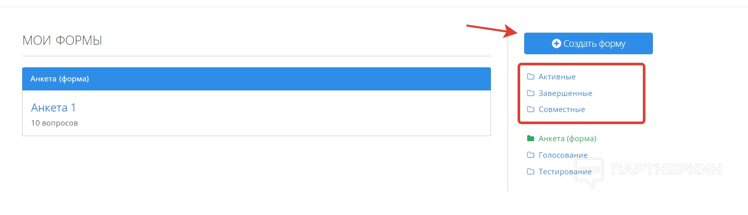 Когда все настройки будут выбраны, созданная анкета отобразится в разделе «Мои формы». При этом обращаем внимание на фильтрационную систему, которая разделяет формы на активные, завершенные и совместные.